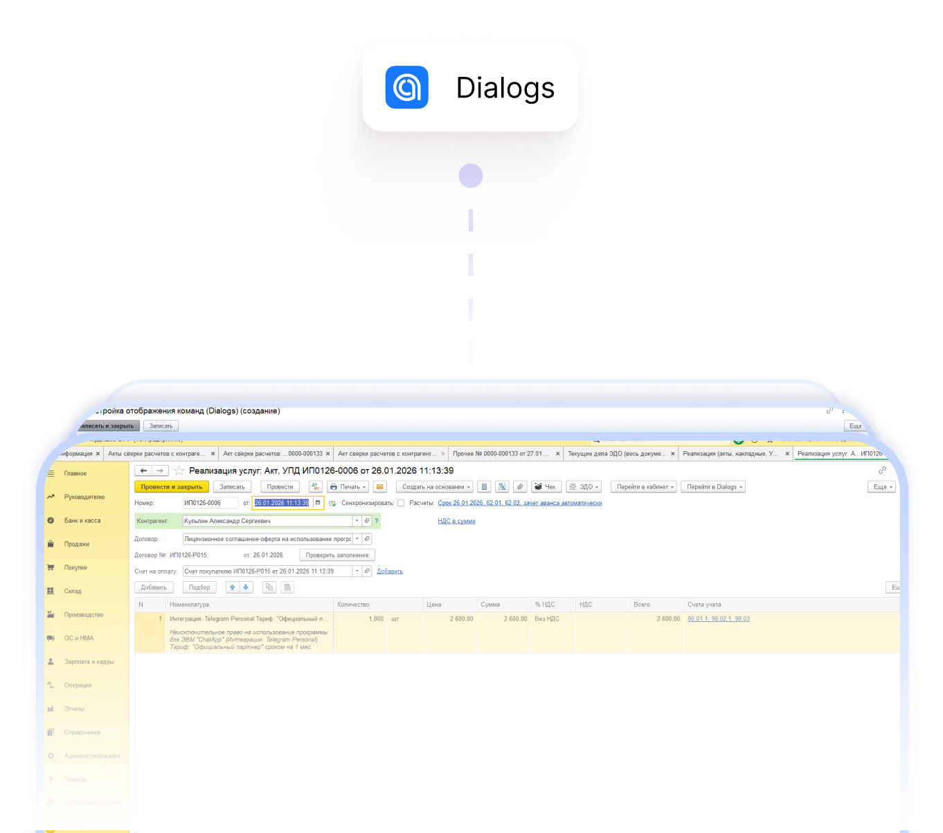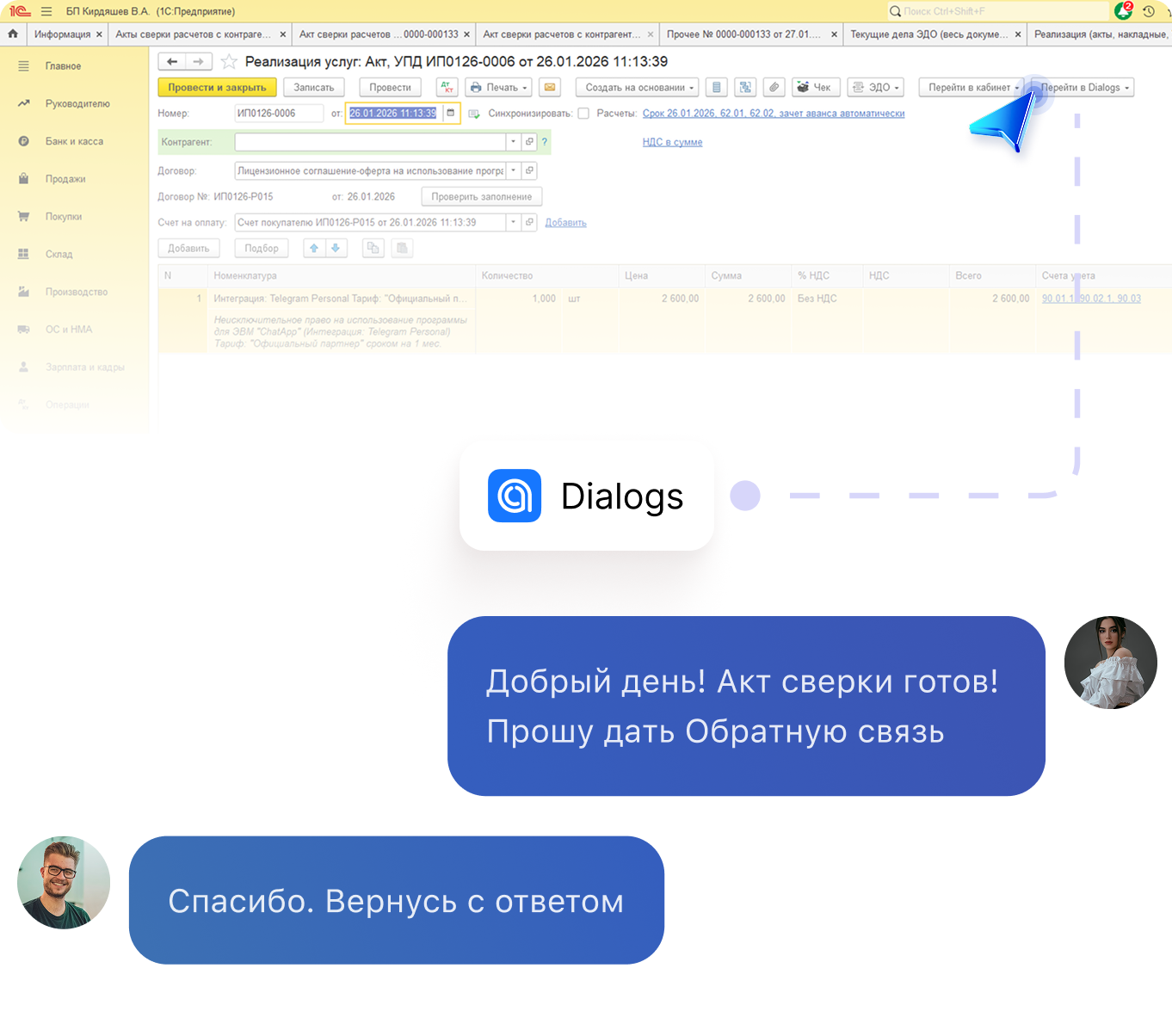Communicate with clients from 1C in one click. No switching, with full dialog history. Stop wasting time searching for contacts in messengers — invest your resources in what matters